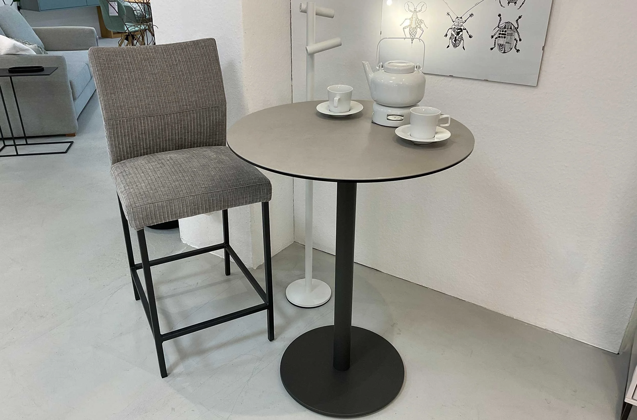 Ausstellungsstück. Bistrotisch in Tresenhöhe, Platte Keramik Farbe grau. Durchmesser 70cm H90cm. Untergestell Metall schwarz matt. Ohne Dekoration.