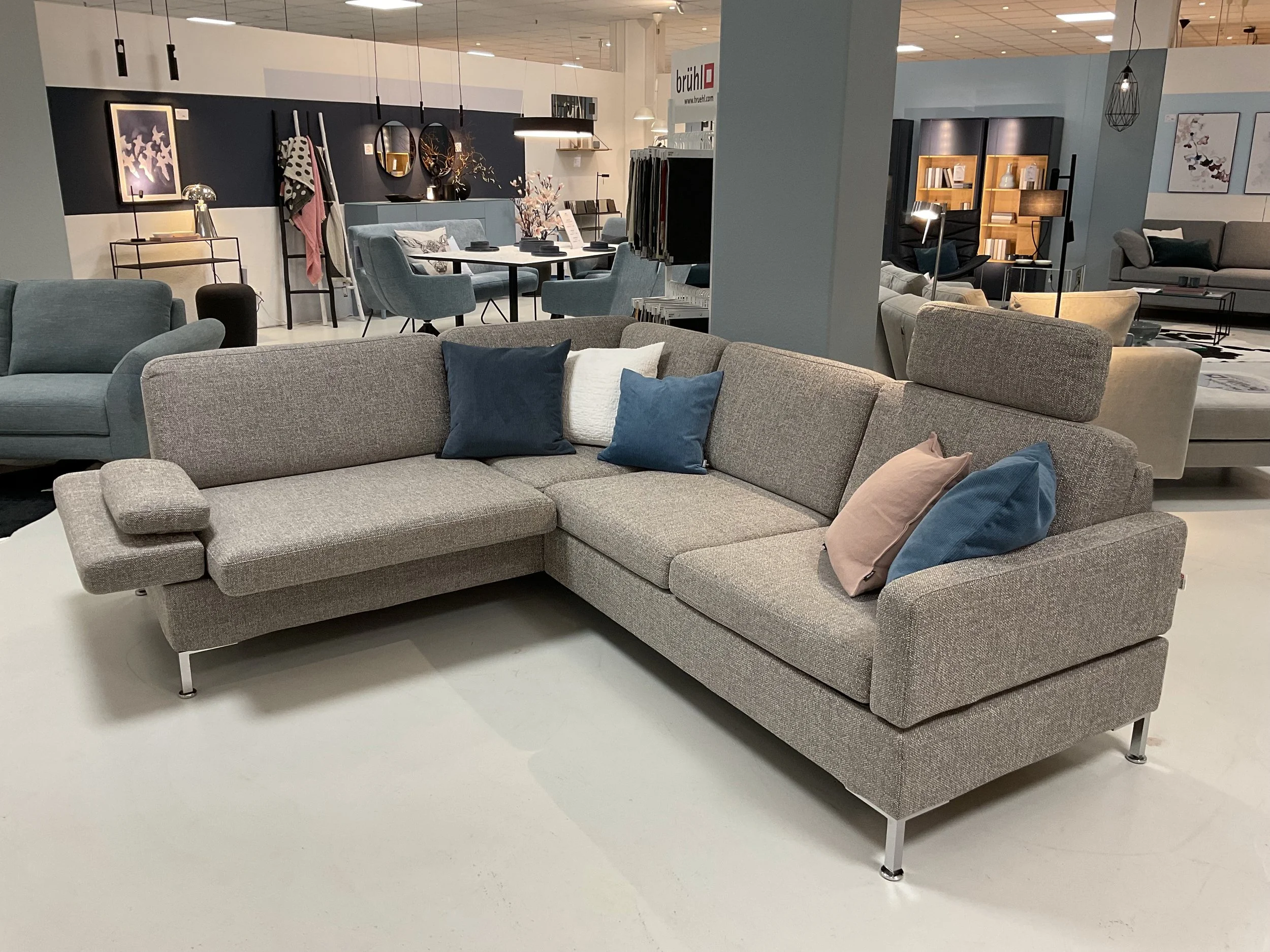 Ausstellungsstück. Eckgruppe ALBE all in ONE von Brühl. Schenkelmaß 243(263) x 195(215)cm. Funktionssofa mit Sitztiefenverstellung. Armlehnen abklappbar. Bezug Stoff grau/wollweiss meliert. Bezüge komplett abziehbar mit Klettverschluss. Sehr bequemer Sitzkomfort mit Kaltschaumpolsterung. Füße Metall chrom - höhenverstellbar. Ohne Dekoration.